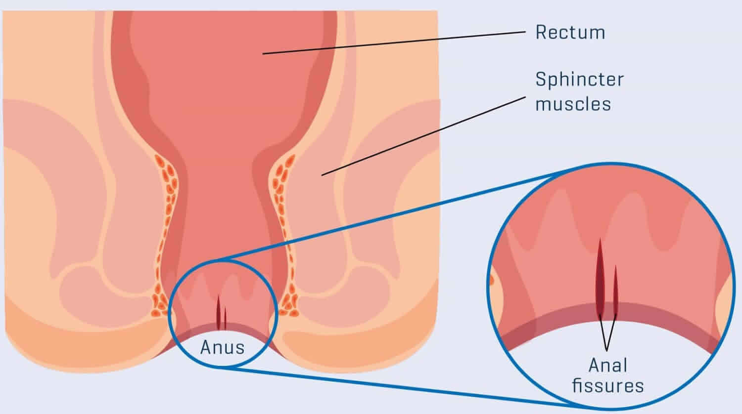 An anal fissure is a cut or a tear in the thin, delicate lining of your anus. The tear often exposes the muscle around the anus, called the anal sphincter. The damage can cause that muscle to spasm, which can pull apart the edges of the fissure even more. The spasms can cause pain and slow down the healing. Bowel movements can also keep the fissures from getting better.