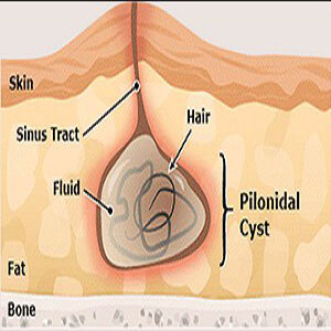 A pilonidal sinus (PNS) is a small hole or tunnel in the skin. It may fill with fluid or pus, causing the formation of a cyst or abscess.A pilonidal cyst usually contains hair, dirt, and debris. It can cause severe pain and can often become infected. If it becomes infected, it may ooze pus and blood and have a foul odor.